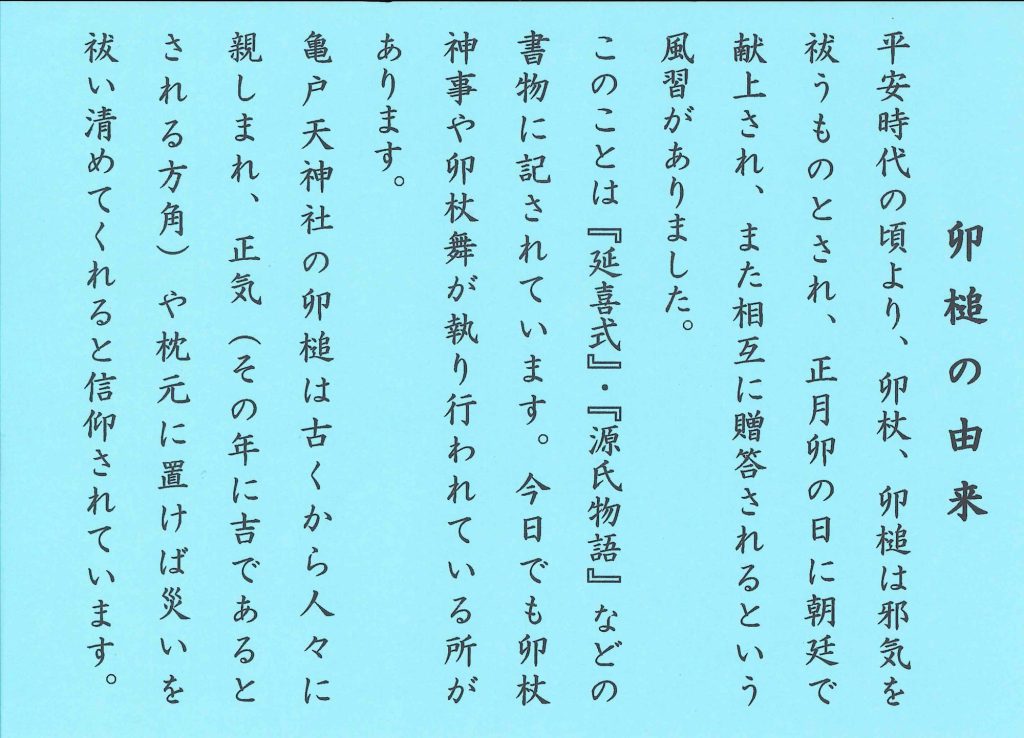 ネットで検索すると、「卯槌」「卯の神札」が授けられるのは、亀戸天神社内の「御嶽神社」や大阪の「住吉大社」が有名で、京都の「上賀茂神社」では邪気を祓う「卯杖の神事」が行われているそうです。